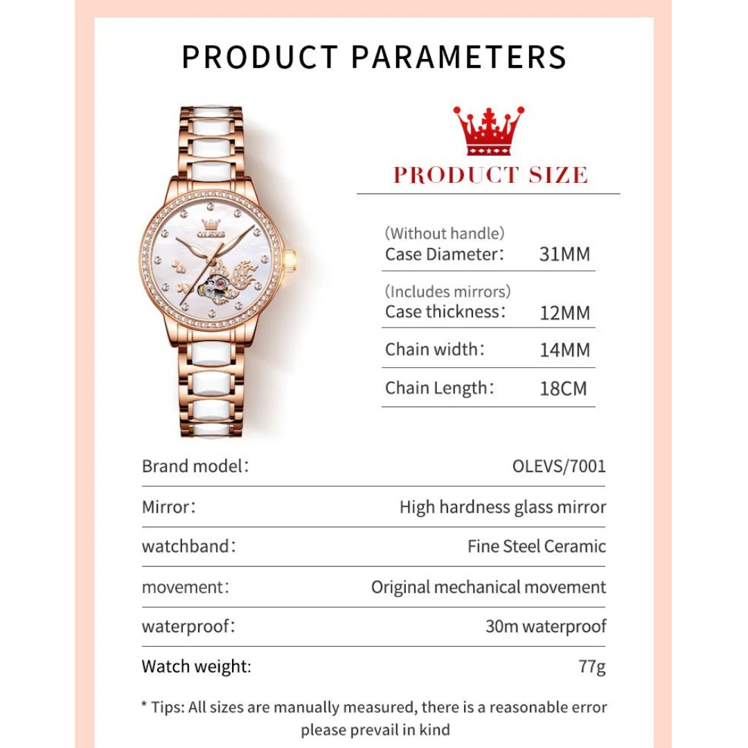 OLEVS 7001 Moda ve Rahatlık Otomatik Kadın Saati, zarif ve fonksiyonel tasarımı ile öne çıkıyor. Hem şık hem de kullanışlı yapısı ile her anınıza eşlik edecek bu saat, tarzınızı tamamlayacak. Velordia'da OLEVS 7001 ile stilinize zarafet katın.
