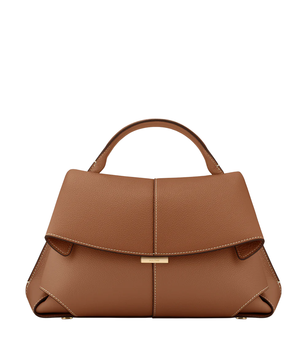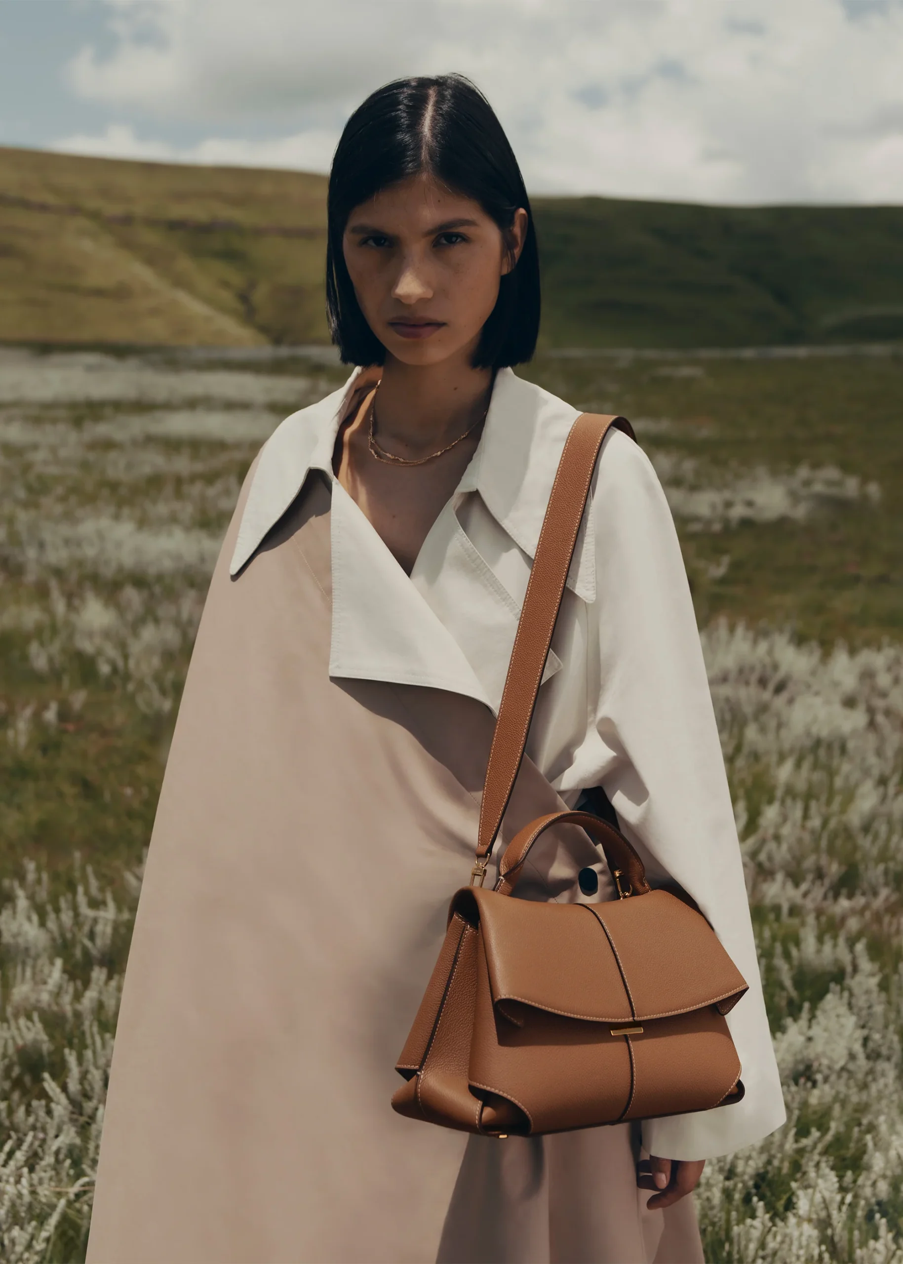 Dokulu derisiyle katlama sanatını sergiliyor. Köşeler, dokuların ince bir etkileşimi için pürüzsüz deriyi ortaya çıkarmak üzere kesilmiştir. Çantanın iç kısmı geniştir ve bölmelere ayrılmıştır, hepsi oymalı bir toka içeren bir kapakla korunmaktadır. Çıtçıtlı kancalarla yerinde tutulan ayarlanabilir omuz askısıyla model hareketlerinize sorunsuz bir şekilde uyum sağlar.