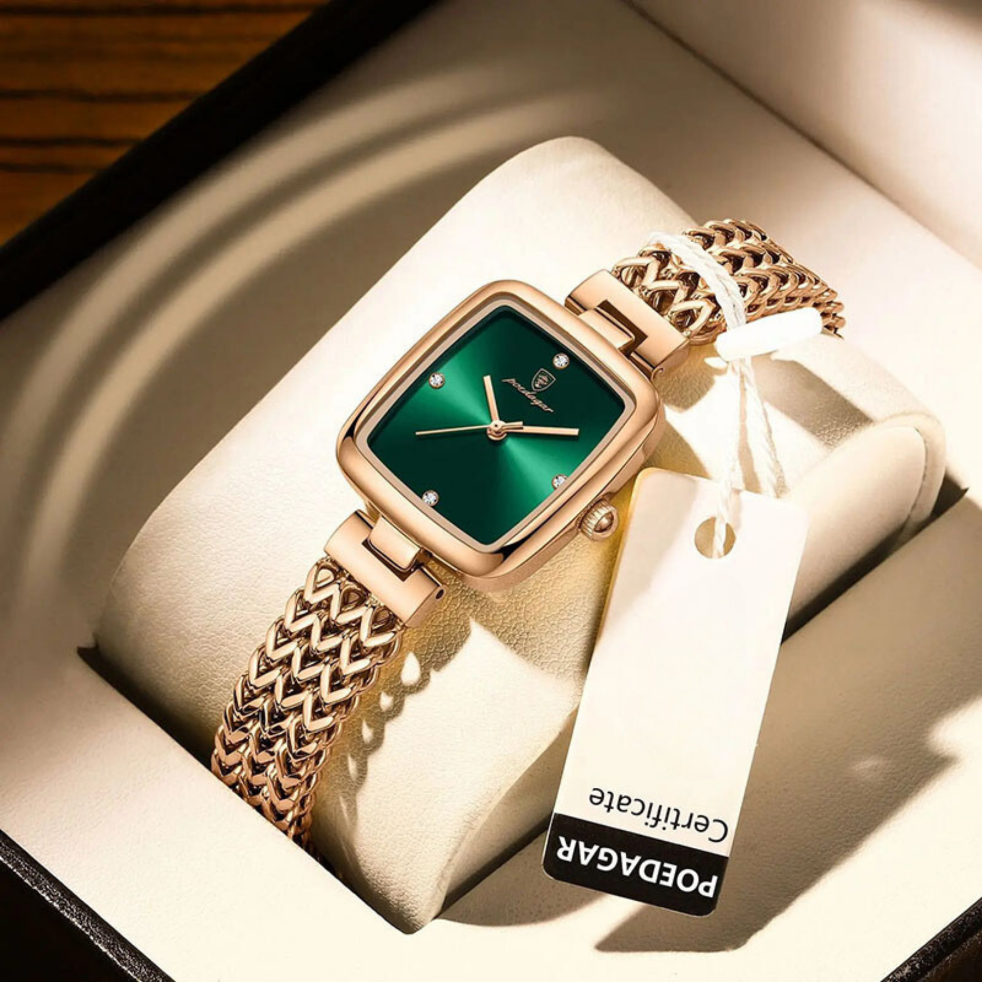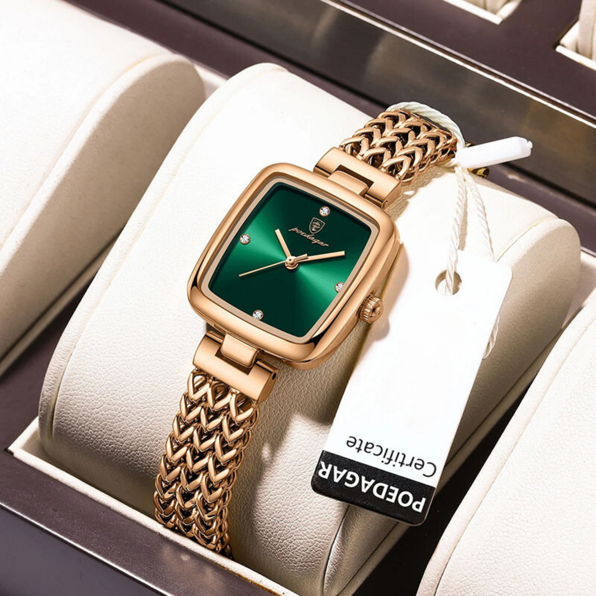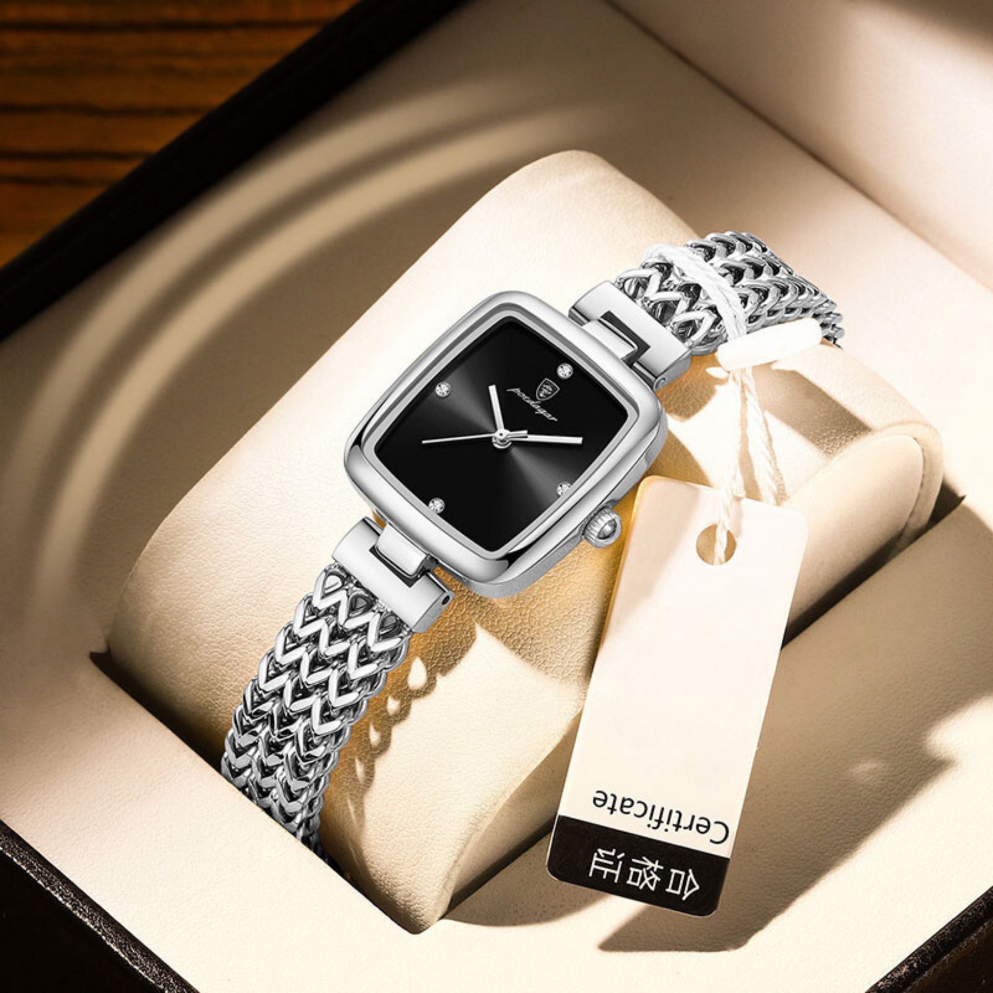 Zarif Kare Tasarım: SHU ER PO768, 28mm çapındaki kare kadranı ve 8mm kalınlığındaki ince kasasıyla sofistike bir görünüm sunuyor. Modern ve minimalist tasarımı, moda ve casual stillerinizi tamamlayarak her ortama uyum sağlar.